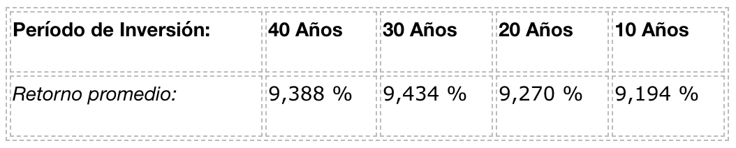 El promedio de rendimientos anualizados de éste índice para períodos de 10, 20, 30 y 40 años es el que muestro debajo: